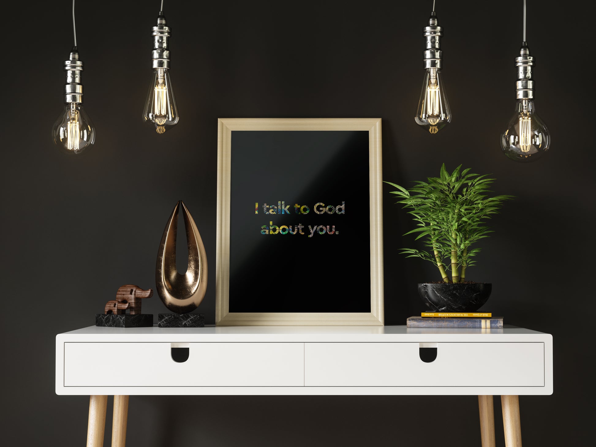 Introducing our stunning Fine Art print, featuring the inspiring quote "I talk to God about you" in boldcolorful fine art patterned letters set against a luxury and elegant black background.