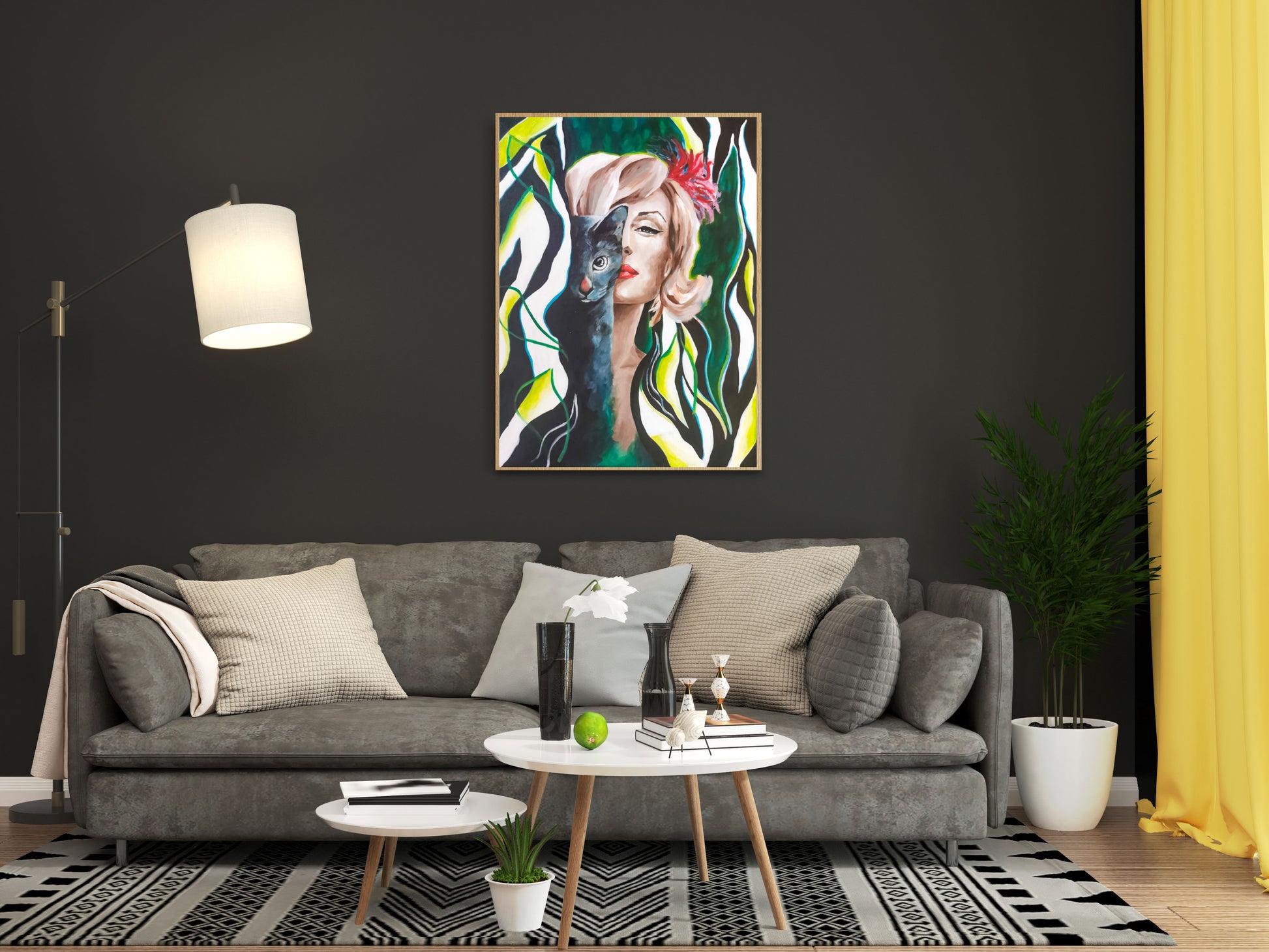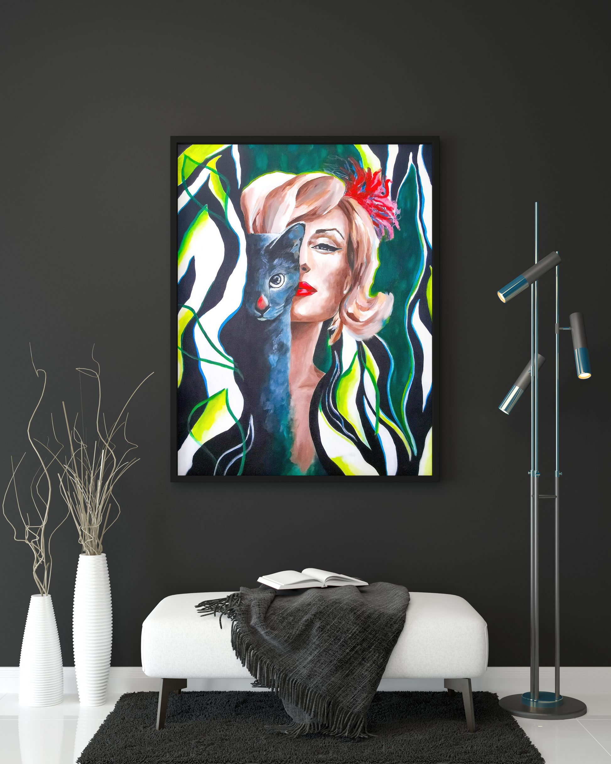 This stunning Fine Art print boasts a beautifully painted contemporary portrait of the iconic Marilyn Monroe, gazing off into the distance with her signature pout and perfectly coiffed hair. Alongside her sits a sleek black cat, casting an enigmatic gaze towards the viewer. The vividly rendered colors and intricate brushwork bring both subjects to life, making this piece a true masterpiece of modern art.